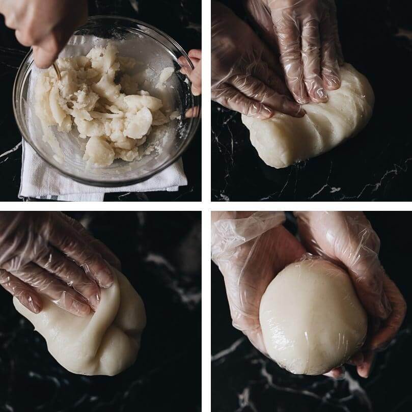 Bước 4: Các nguyên liệu sau khi được khuấy điều, hãy dùng tay nhào nhẹ để tạo thành một khối mịn dẻo như mong muốn. Lưu ý, không được nhồi bột quá lâu vì như vậy bột sau khi nướng sẽ mất nét, nứt vỏ. Bột sau khi trộn xong sẽ bị ướt do đó hãy đem đi ủ. Trường hợp bột bị khô và không được mịn bạn nên thêm nước đường để bánh được mềm nhé.